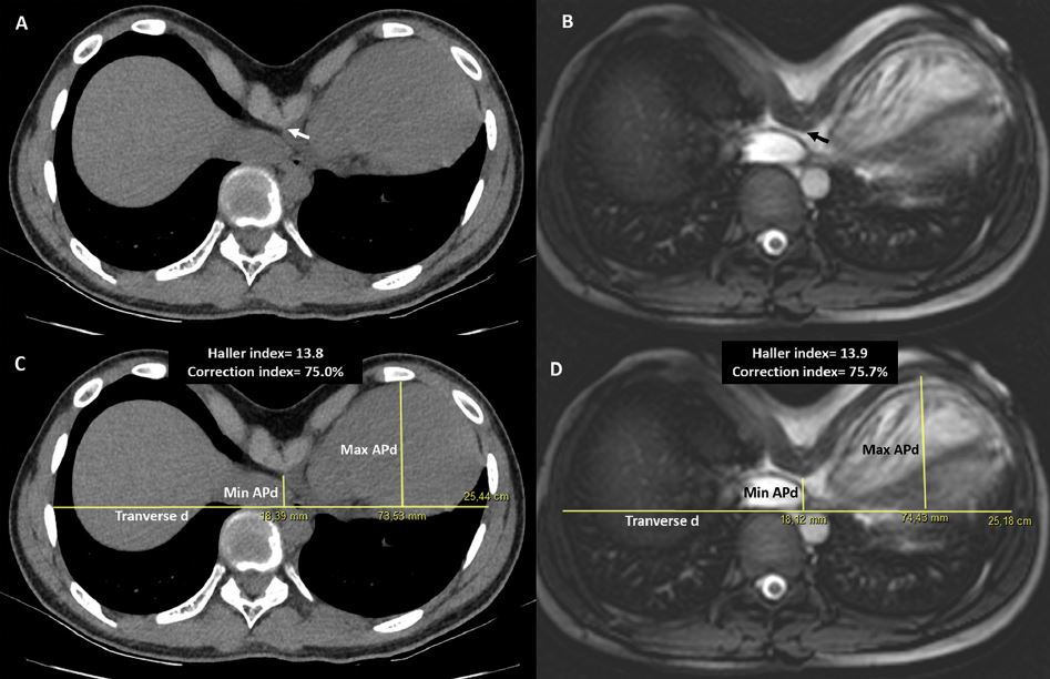 Conclusiones: Demostramos una excelente concordancia entre la TC de tórax y la RMC estándar para la evaluación de malformaciones de la pared torácica, lo que potencialmente permite la evaluación preoperatoria de la gravedad de la EP y la afectación cardíaca con una única herramienta de diagnóstico.