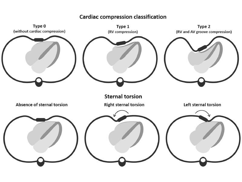 Antecedentes / propósito: Se desconoce el papel de la torsión esternal (ST) en pacientes con pectus excavatum (PEX). Evaluamos la relación entre ST y los índices de malformación torácica y compresión cardíaca (CC). Métodos: se incluyeron pacientes consecutivos con PEX a los que se les realizó tomografía computarizada de tórax y resonancia magnética (RMC) para definir la candidatura quirúrgica. Los índices de malformación incluyeron el índice de Haller (HI), índice de corrección (CI) y ST. La CC y la relación entre el ancho del anillo tricúspide y el anillo mitral se evaluaron mediante RMC.