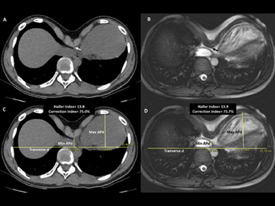 Objetivo: la evaluación preoperatoria de pacientes con pectus excavatum (PE) exige la evaluación de la malformación índices, generalmente con tomografía computarizada (TC) de tórax. Además, la evaluación del impacto cardíaco de La depresión esternal se ha convertido en una regla en los centros de alta referencia, por lo que se requieren dos modalidades de imágenes independientes y utilizar radiaciones ionizantes en una población muy joven. El objetivo de este estudio fue explorar el acuerdo entre la TC de tórax y la RM cardíaca estándar (RMC) para la evaluación de los índices de malformación de la pared torácica.
